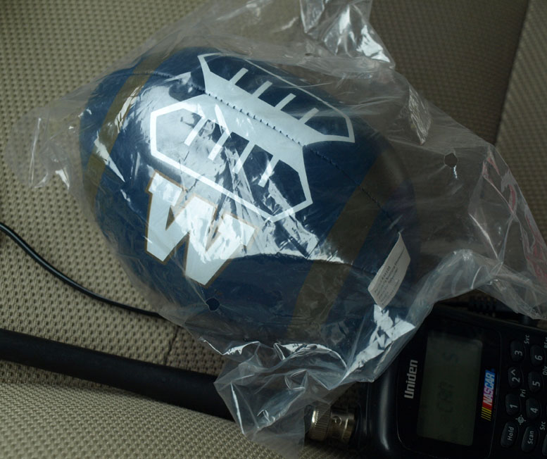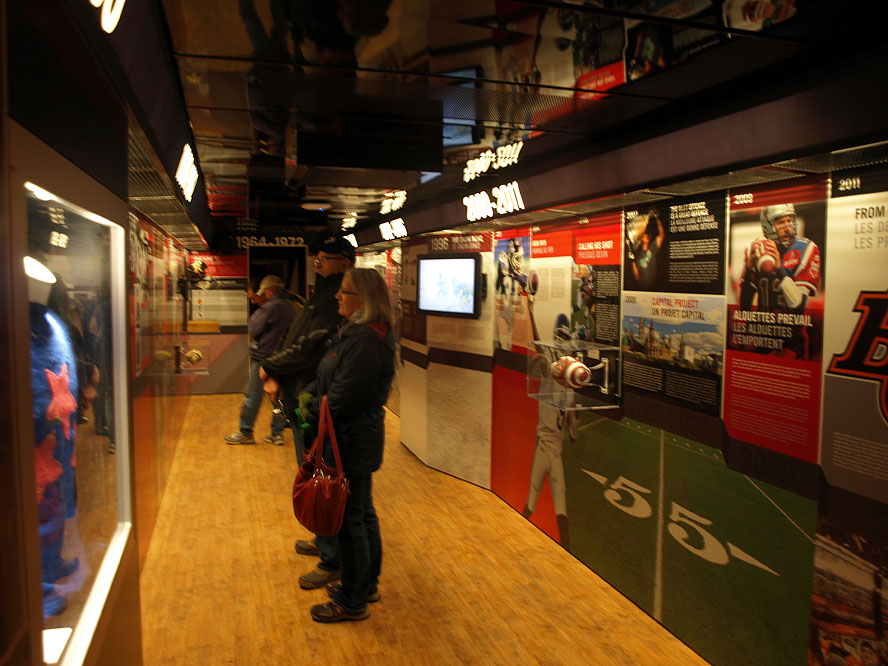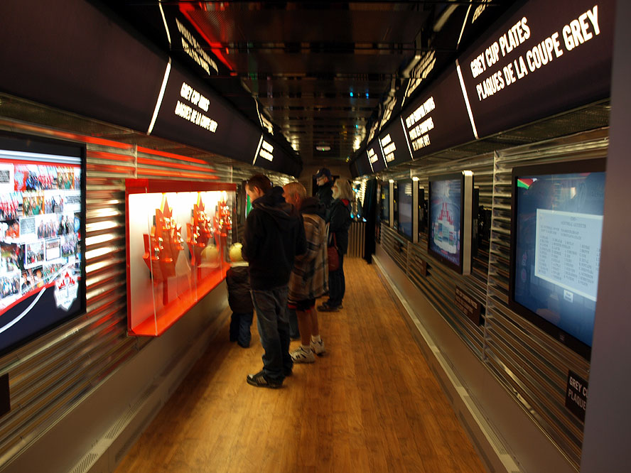 The wind, driving rain and piercing ice droplets were extremely challenging to my photography mission. I was well dressed for the weather but the wind nearly blew me over a number of times and it was wet, rainy and muddy everywhere. The camera lens also kept getting pelted with rain drops and I went through a lot of Kleenex continually wiping off the lens. My clothes were soaked and the rain and slush filled the air and made many of the photos appear fuzzy. Seeing VIA 6445 on CP tracks was exciting enough for me but I also decided to board the display train. I got a nice "Winnipeg Blue Bombers" sponge football, temporary tattoo sticker and someone on the train was offering a 1 for 1 exchange of special Grey Cup loon dollar coins. I had seen them in my change previously so declined the kind coin offer and toured the rest of the train. The heating in the cars was welcome as it was only +3 outside (-3 with windchill) and my clothes were wet. I also got my photo taken with the cup at no charge. The CFL did a bang up job with this display train. Kudos and thanks to all the smiling faces and friendly volunteers who made this a memorable experience.