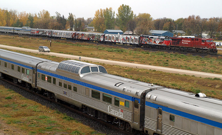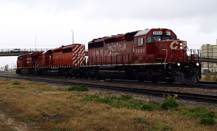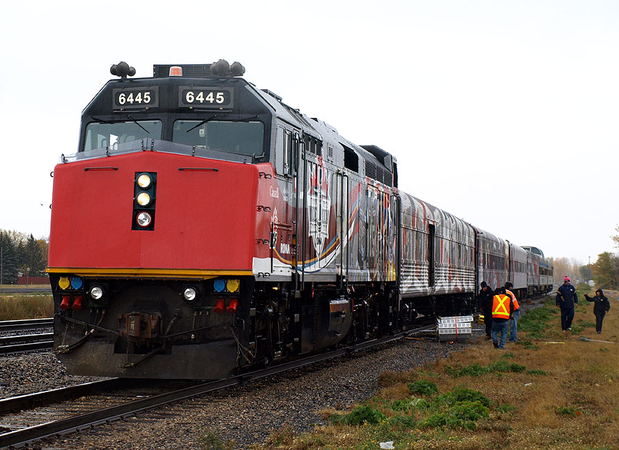 Shortly after 2:30, a WB rail train stopped and uncoupled CP Rail SD40-2s 5864 and 5991 (two more classics!) and fetched 8711 from the front of the Grey Cup train. CP 8711 had been piloting this train on CP since Edmonton. Seeing it removed at this point was surprising as I was hoping for the train to proceed to Winnipeg via the Carberry sub. I spoke to a couple of other railfans (I only saw three the entire day) and was disappointed to learn that my plans to photograph 6445 at Meadows and Marquette (classic wooden grain elevators!) were foiled. CP 8711 was placed behind 5864 and 5991 on the welded rail train and proceeded west, leaving VIA 6445 to lead the Grey Cup train for just a short distance on rare CP trackage in Portage.