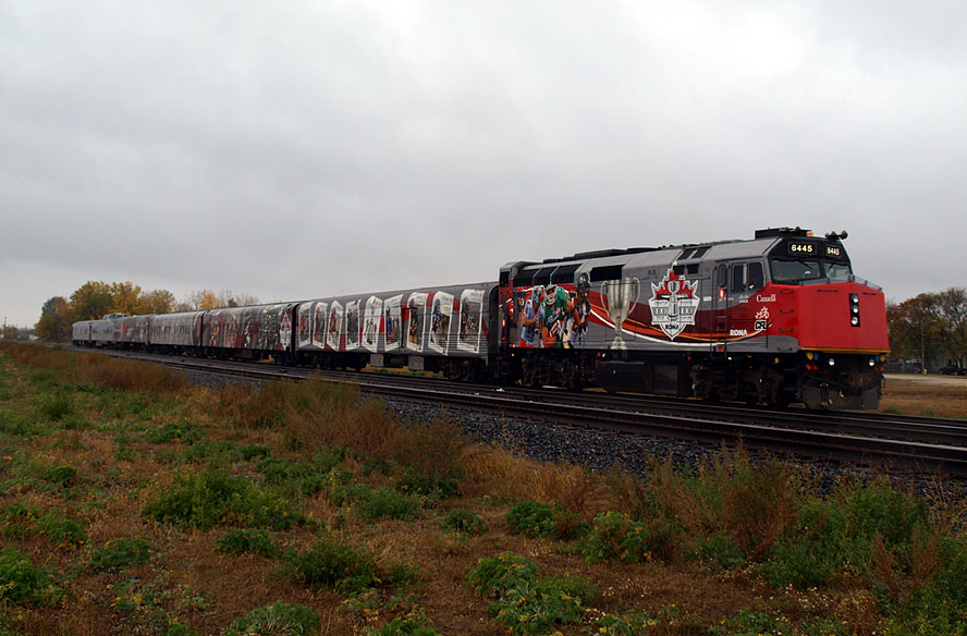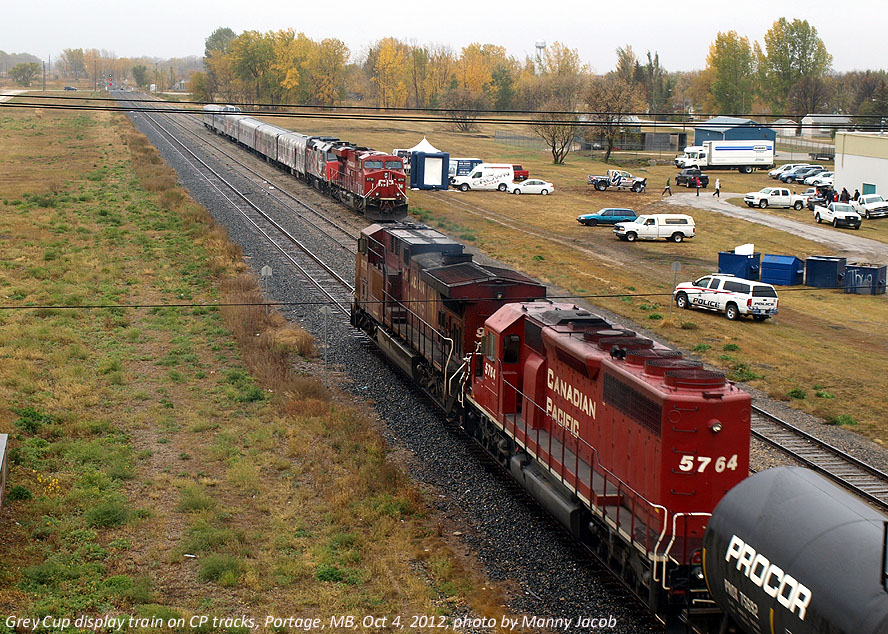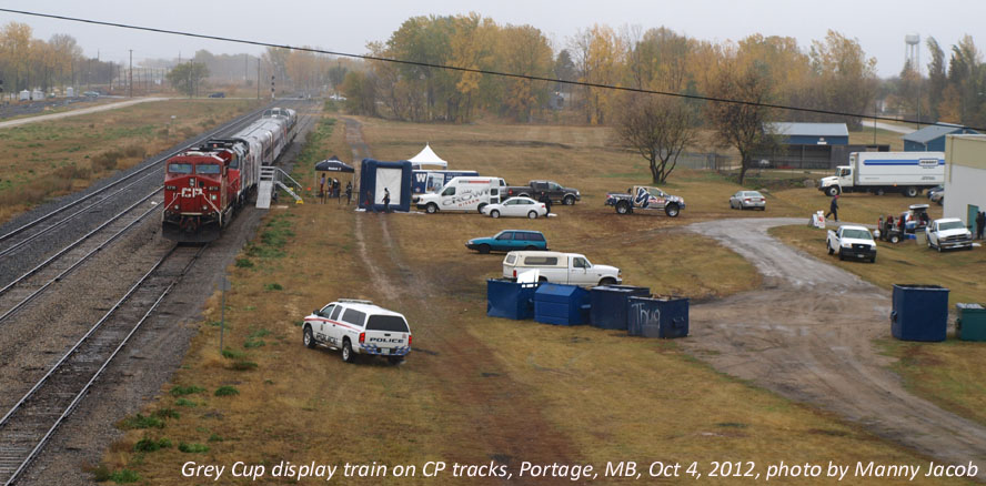 ***Don't forget to check out PAGE 2 (link below)!*** On an extremely unpleasant, windy, rainy and snowy October day I made the trek to Portage to experience the CFL Grey Cup train. While the train was scheduled to display in my home city of Winnipeg on the upcoming Saturday, I felt that access, photos and parking would be much easier in Portage. So I took Thursday afternoon off from work, picked up my lunch before leaving the city and braved the weather bomb for the hour drive west. The Grey Cup Tour website indicated the train was scheduled to enter Manitoba via the CP Rail Bredenbury sub (after displaying in Yorkton SK) and then into Portage via Minnedosa. The website also said that the train would be on display in the back lot of the Portage Centennial Arena as opposed to the CN side where F40s are usually seen. This meant F40PH-2D 6445 would be on some very unfamiliar trackage. I first photographed Grey Cup 6445 on the CN line just a few feet away last month and was fascinated at the prospect of seeing this unit on the opposite line. Here's what the display looked like when I first arrived at 12:24PM.