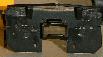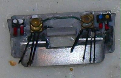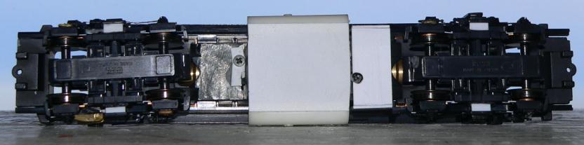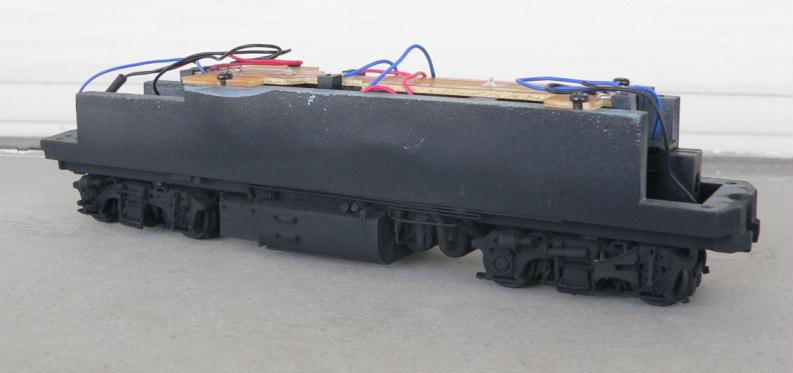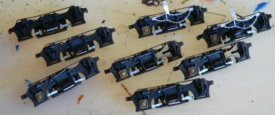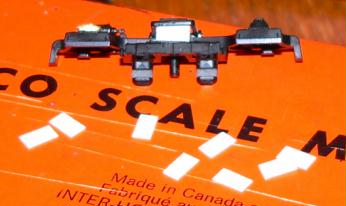 Underframe Get out your safety glasses, work gloves and Dremel cutoff disc and grind off part of the Kato frame as shown below. This is necessary to make room for the VIA air tanks. Do this heavy work outdoors and with all the right clothing and safety gear as this is a dangerous operation with bits of metal flying all over the place. For Kato, the plastic side contact railings need to have the two narrow skirts (one per side) filed off as well as the air dryer part. Next, file down some of the step detail and snip off the engine door step from the stirrup step collar. Attach your home made resin fuel tank side castings and glue a styrene plate underneath the fuel tank halves. Build a battery box out of .020 styrene and glue the fret battery box sides to the ends of this box. Glue the box to the underframe. Build and install air tanks, air dryers, numerous lines and traction motor cables as shown in these photos. Both Kato drives masked and airbrushed with flat black paint. Ready for mounting to shells. |