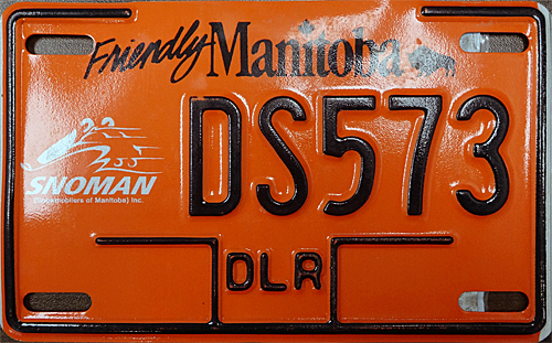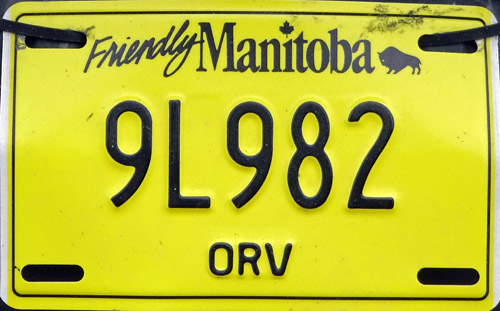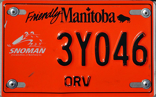 - Things got crazy after late-2017 when a new style yellow ORV plate emerged with smaller Snoman dies and screened "Friendly Manitoba." These plates have been observed in many series including high-7J, all K, 1-6L, 6N, 6P, 6R, 6U and 6W. Yellow ORV plates in the 6U and 6W-series used letters otherwise part of the orange Snoman series, meaning both 6U and 6W-series were omitted from the Snoman plates.